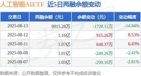 本站消息,8月13日,人工智能AIETF(515070)融资买入1216.9万元,融资偿还2945.01万元,融资净卖出1728.11万元,融资余额9915.28万元。